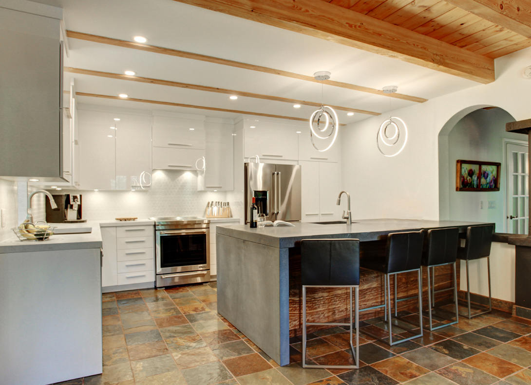 Le défi était de conserver le plancher d’ardoise, le plafond de bois et travailler avec une structure de bâtiment de béton dont nous devons repérer et réutiliser les ancrages existants. Les nouveaux cabinets en acrylique blanc lustré et l’îlot en noyer plaqué, complètement repensés, s’agencent parfaitement. La présence de deux teintes de comptoir, un béton plus foncé pour l’ilot et plus clair pour le comptoir, apporte de la profondeur à la pièce. L’éclairage a été amélioré tout en conservant le bois au plafond. Nous avons créé des retombées entre les poutres afin de nous donner accès aux appareils d’éclairage. Cet exercice nous a permis de délimiter les zones entre la cuisine et la salle à manger et d’optimiser la luminosité naturelle puisque les couleurs pâles réfléchissent mieux la lumière.